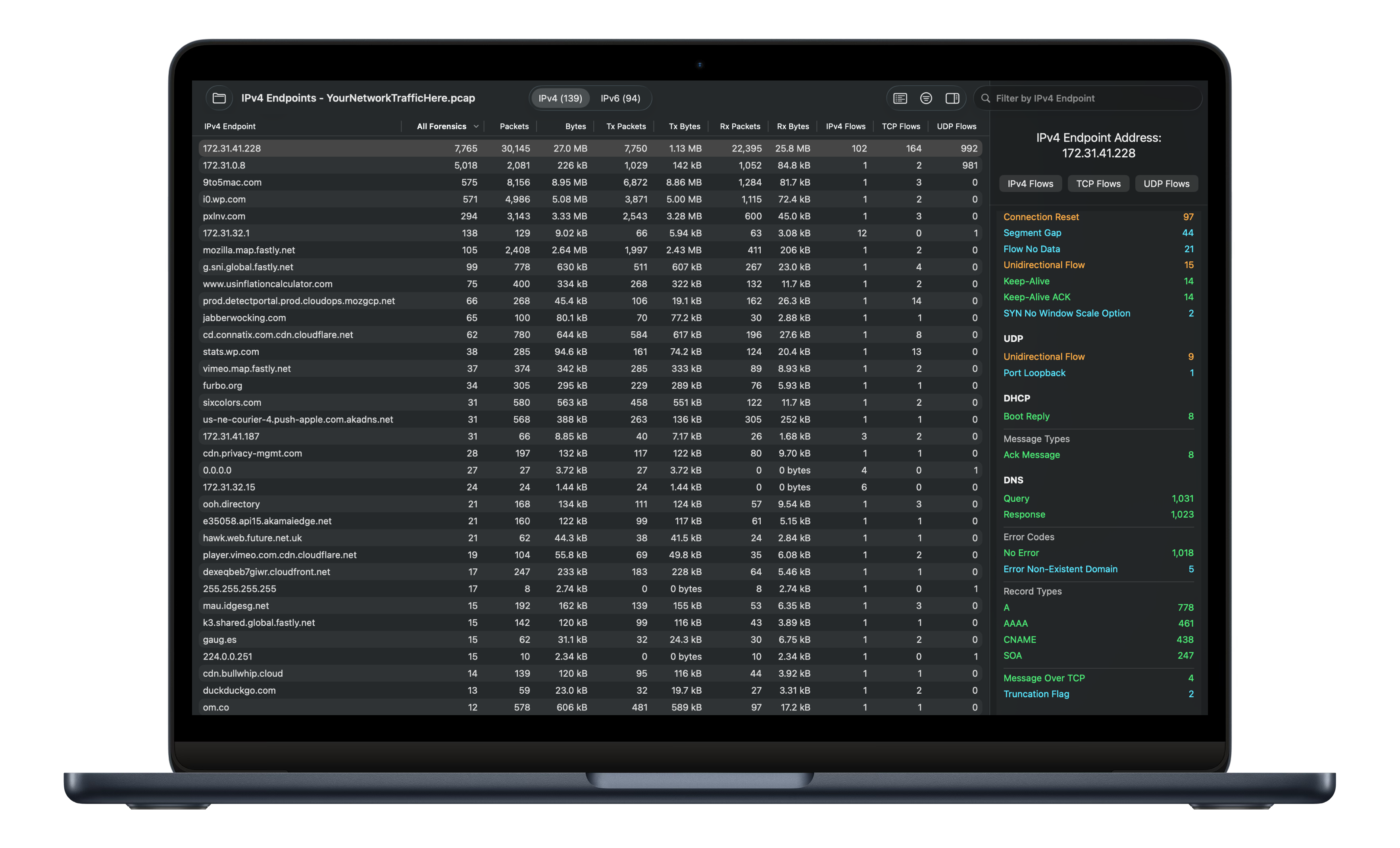 Capture File Forensics quickly and easily extracts network forensic information from capture files. When a capture file is loaded, CFF analyzes all packets in the file and creates the following tables: