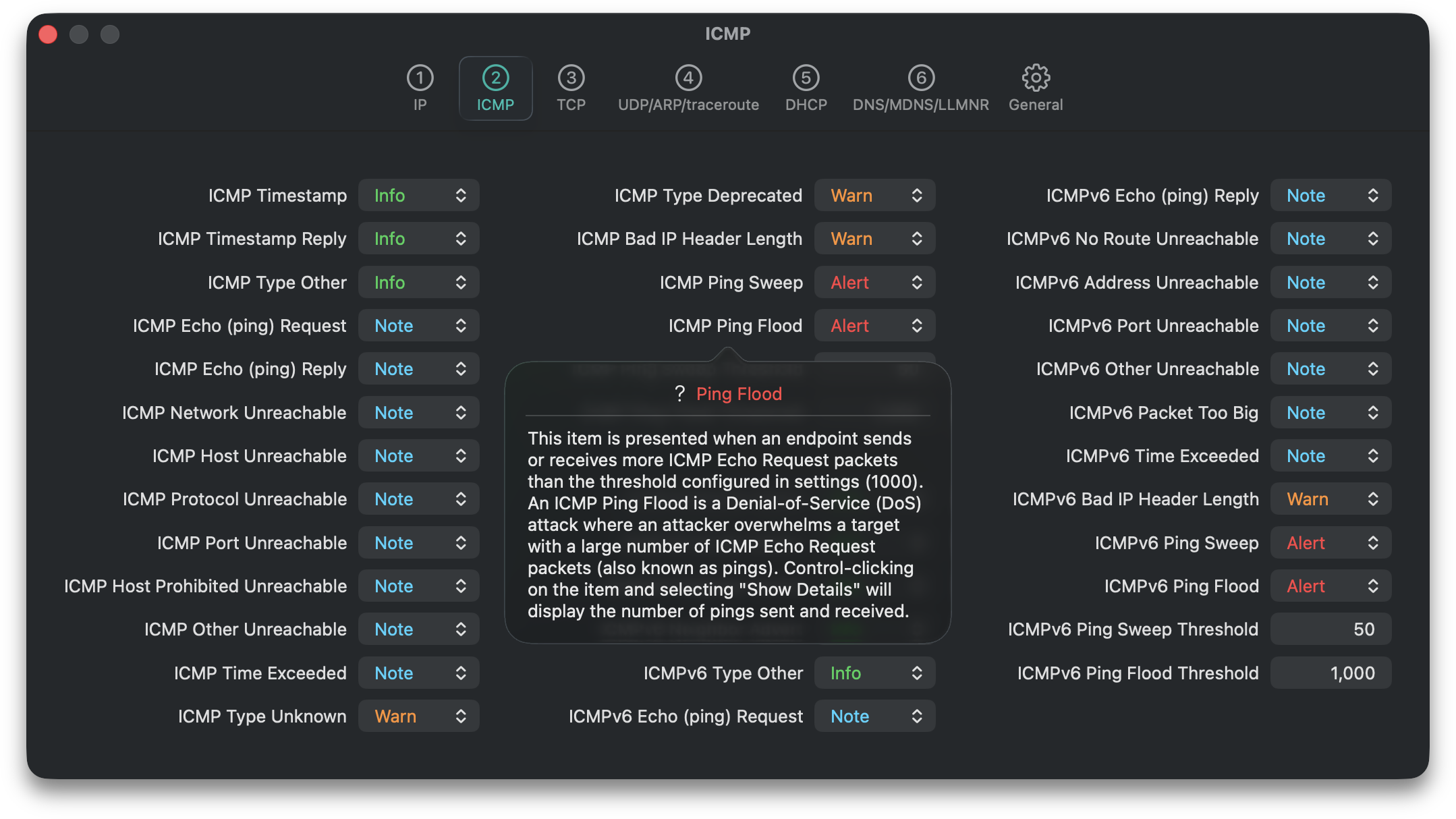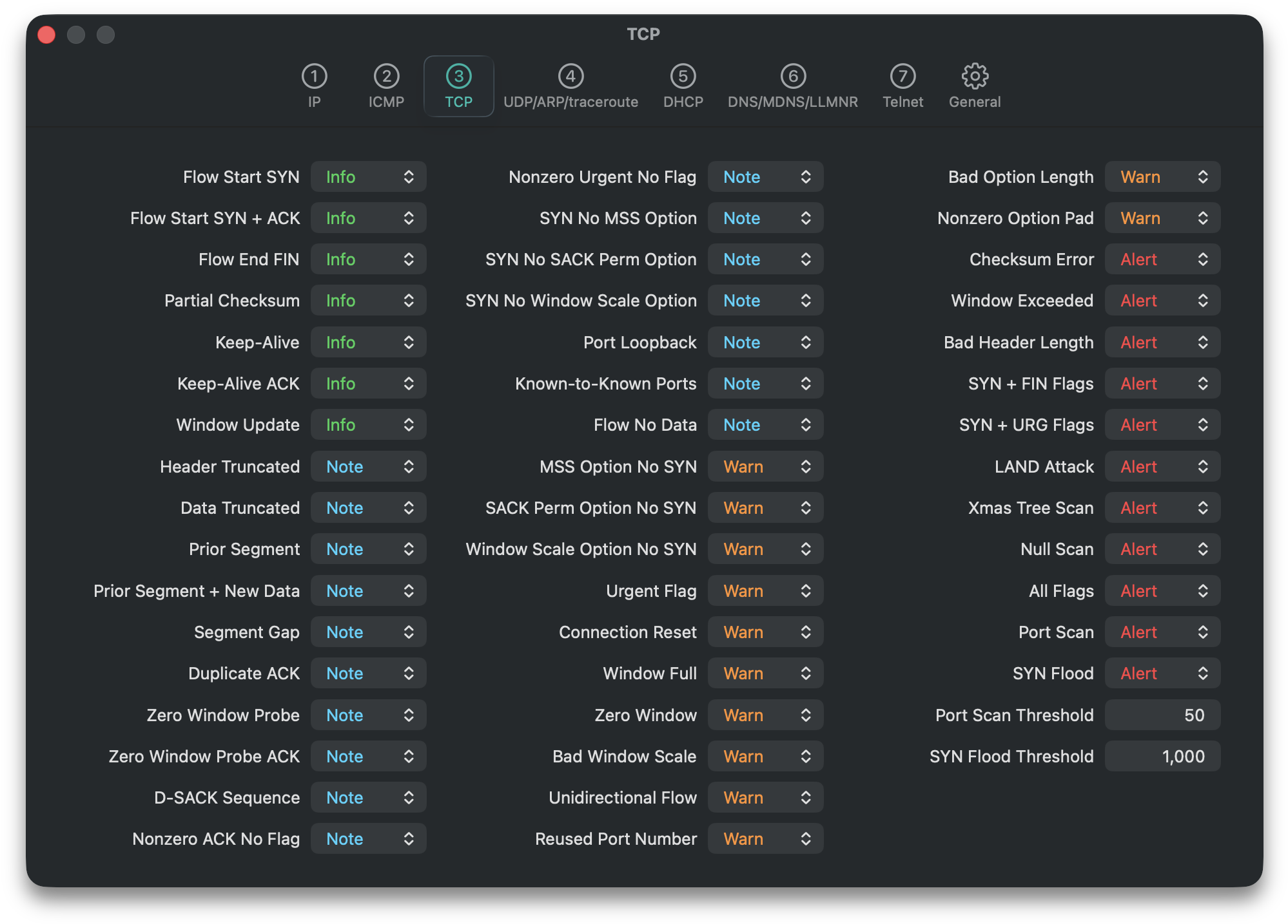 Each information element can be configured to one of four levels (Info, Note, Warn, Alert) or Disabled. Control-clicking on any information element and selecting “Show Definition” provides the rationale behind the element: